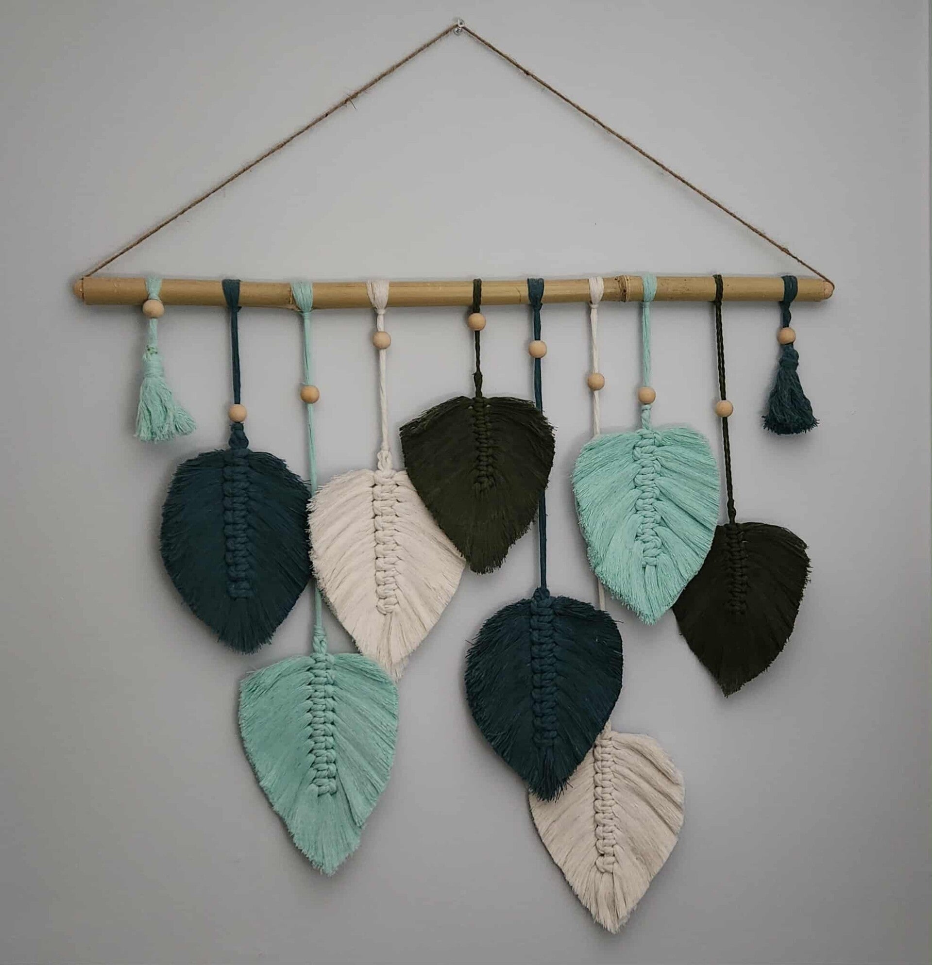 Add a touch of natural elegance to your home with this beautiful handmade macramé wall hanging. Crafted with care from high-quality cotton cord, this piece features intricately braided leaf designs in soothing shades of teal, mint, olive green, and cream. Each leaf hangs from a smooth wooden dowel and is accented with natural wooden beads for a warm, organic feel.